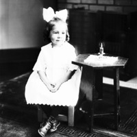 - Portrait of a young girl, a big bow in her hair, seated beside a table with a lighted candle.