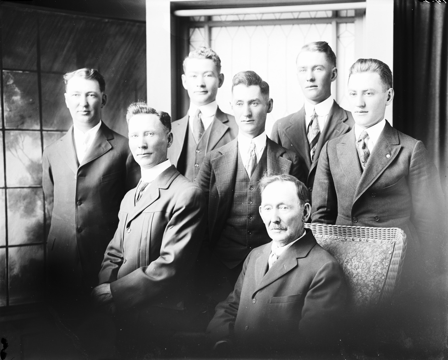 - Portrait of seven men of varying ages, all dressed in suits.