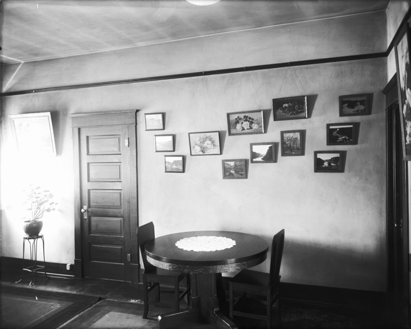 - Interior of Bisbee Studio; room with a table and chairs beneath photos.