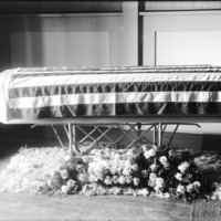 - Flag-draped coffin, flowers displayed beneath with a ribbon reading "Bert."