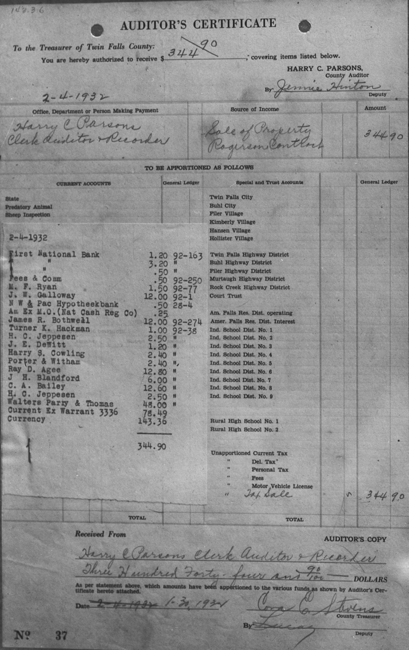 - An Auditor's Certificate for sale of property of Rogerson Contract, paid out by the County Auditor Harry C. Parsons in the amount of $344.90