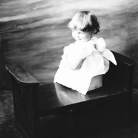 - Portrait of a little girl, seated, looking over her shoulder with her back to the camera.