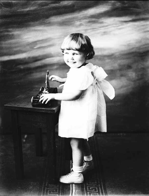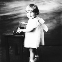 - Portrait of a little girl standing next to a small table.