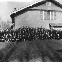 - Large group of men posed in front of the original First Christian Church. The Methodist Church can be see in the background at left.