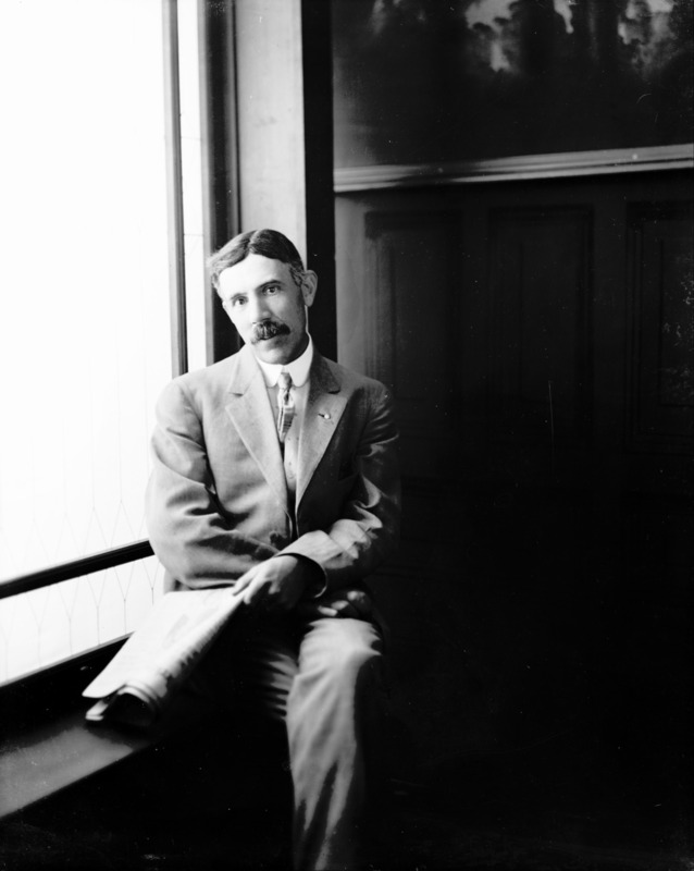 - Portrait of Clarence Bisbee seated on a window ledge in the Bisbee Studio.