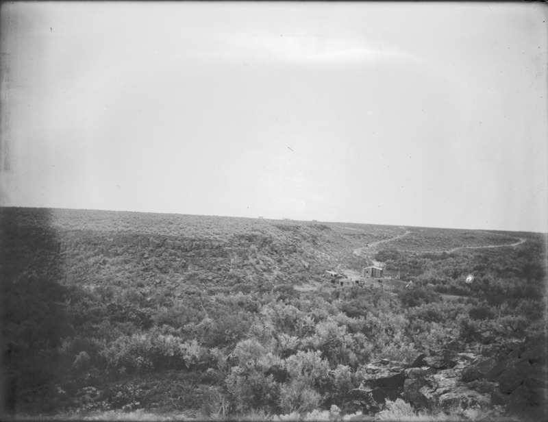 - Small valley with a homestead; a few scattered buildings in the distance.