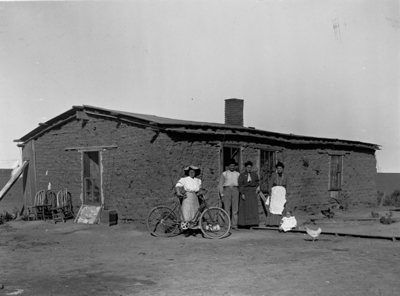 - Sod house; a man and three women, one with a bicycle, stand outside. A baby is seated in front of them.