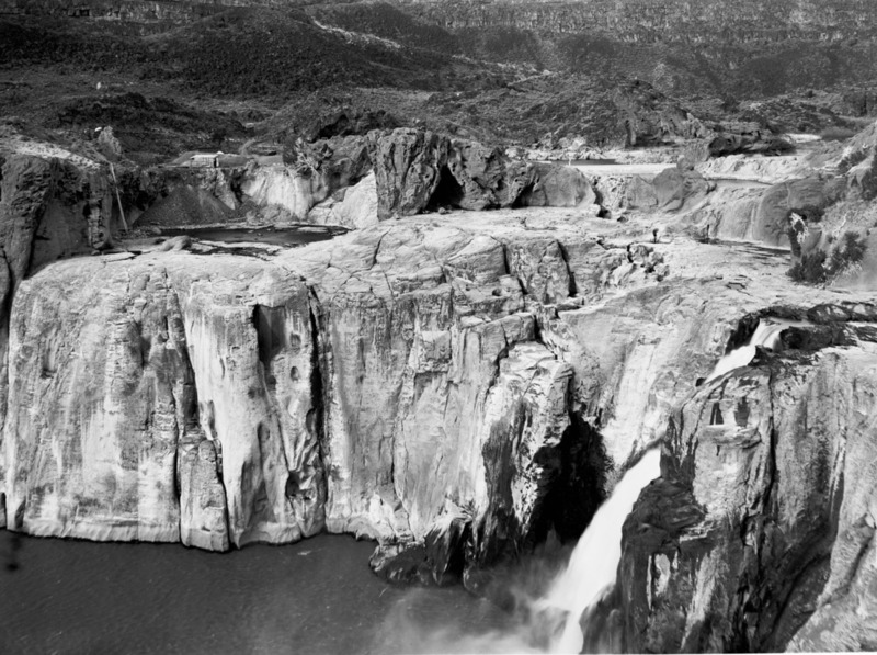 - Shoshone Falls, dry, with construction activity on upper levels.