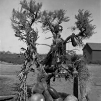 - A large sagebrush draped with agricultural produce.