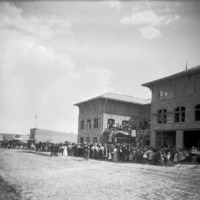 A crowd gathered at the Hotel Perrine and along Main Ave, listening to speeches during Railroad Day. Flags and banners fly from the balcony of the Hotel, which is still under construction.
