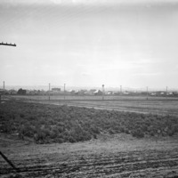 - A wide view of early Twin Falls, looking south, with a few power or phone lines visible. The large building on the center left is Bickel School under construction.