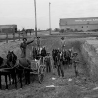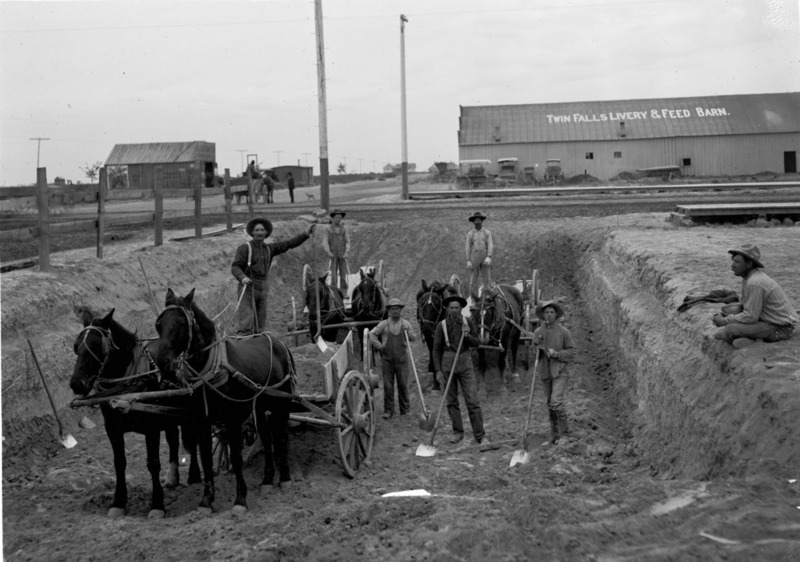 - Teams of men and horses excavate a site. Twin Falls Livery and Feed Barn and a blacksmith shop in the background.