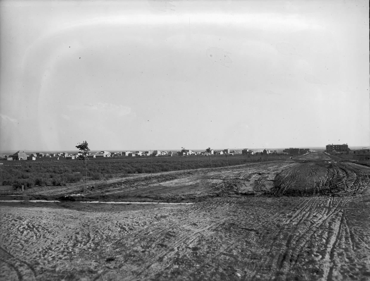 A wide view down Shoshone St, looking southwest. On the left is City Park, with recently planted trees lining the street. The Perrine Hotel is in the background on right.