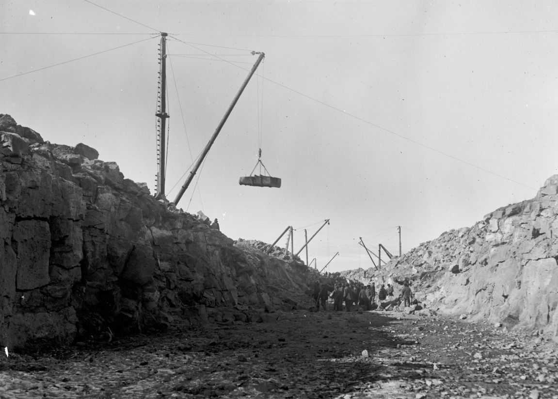 - A crew of men stand at the bottom of a canal channel. Several construction derricks can be seen along the rims.