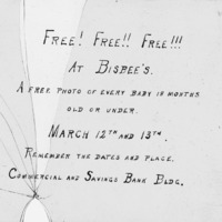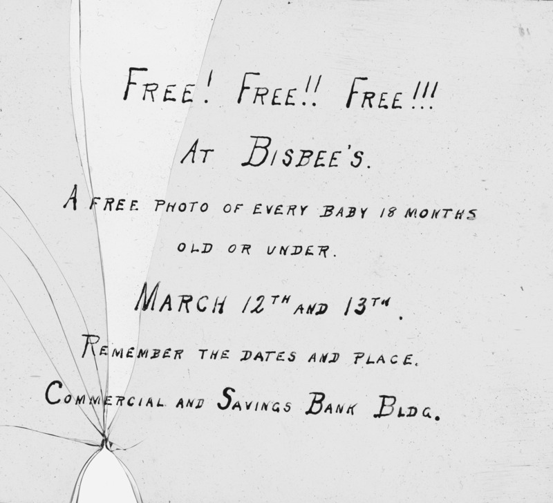 - A Bisbee Studio advertisement that reads, "Free! Free!! Free!!! At Bisbee's. A free photo of every baby 18 mpnths old or under. March 12th and 13th. Remember the dates and place. Commercial and Savings Bank Bldg." Bisbee's Studio was located in the Commmercial and Savings Bank building from 1907-1914.