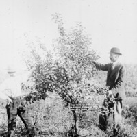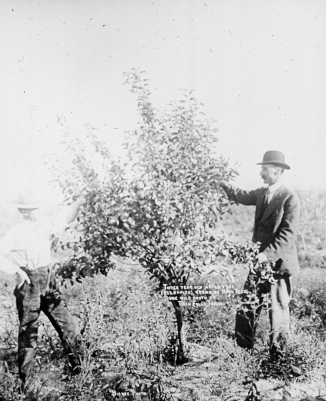 - "Three Year Old Apple Tree (222 Apples), Grown by Hugh Reed, One Mile South of Twin Falls, Idaho." Two men holding tree branches.