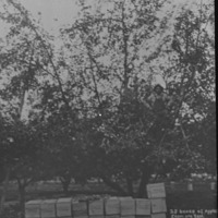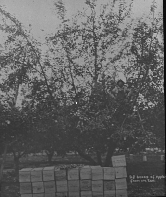 - "28 Boxes of Apples From One Tree;" a man perches in an apple tree, with several boxes stacked on the ground below.