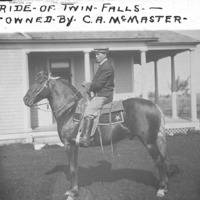 - "Pride of Twin Falls - Owned by C.A. McMaster;" a man on a horse stand in front of a house
