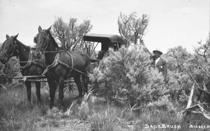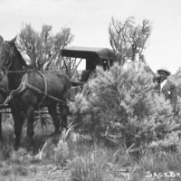 - "Sagebrush;" a man standing amidst tall sagebrush, with a buggy and horses.