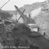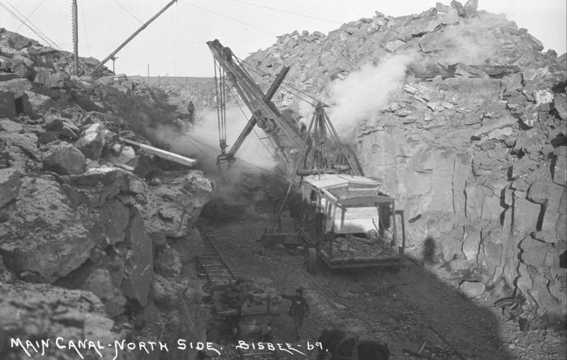 - "Main Canal - North Side;" men and machinery digging out the canal, tram and rail visible on left.