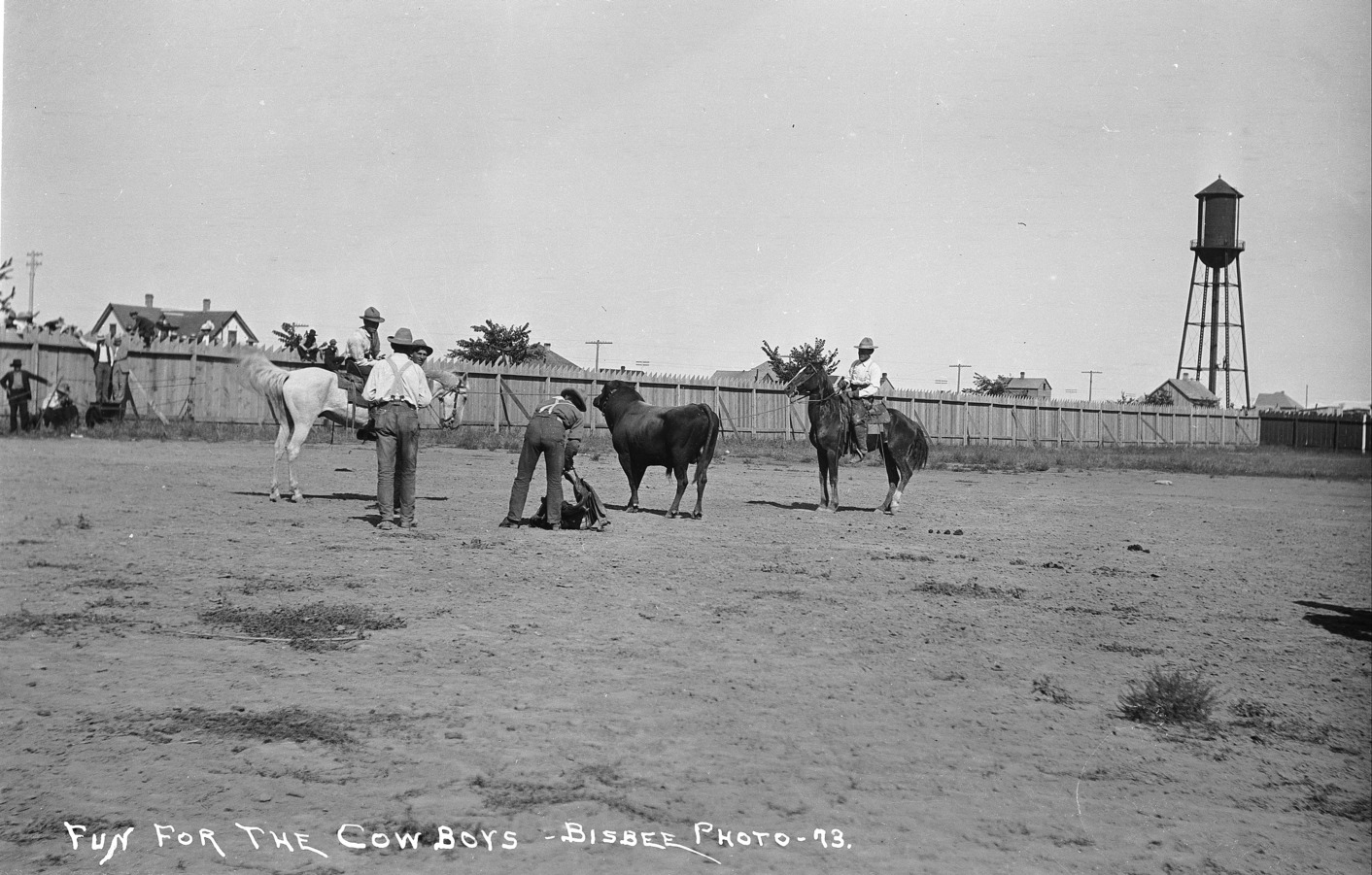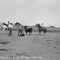 - "Fun for the Cowboys;" cowboys exhibiting horse at the Twin Falls Athletic Field; water tower in background.