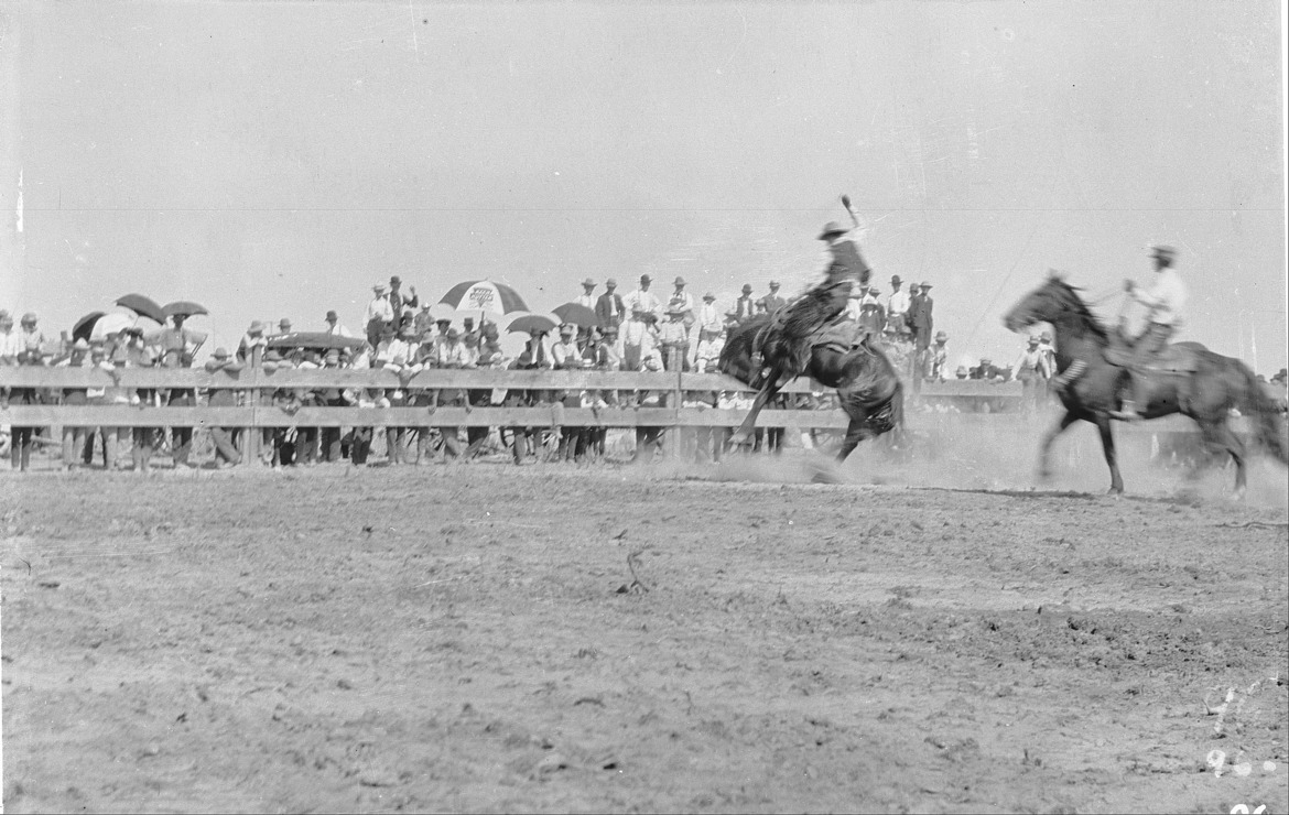 - Two cowboys on horses perform in front of a crowd of people behind a fence.
