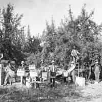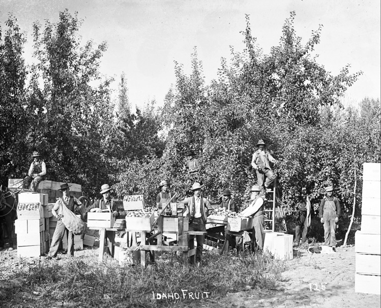 - "Idaho Fruit;" several men stand among boxed fruit in an orchard