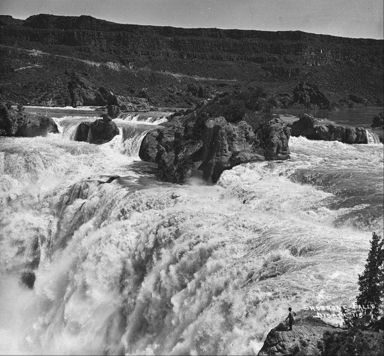- "Shoshone Falls;" a man on the rocks in the foreground looks out over the Falls