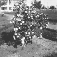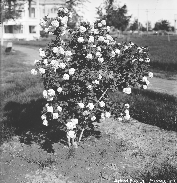 - "Snow ball;" a flowering snow ball bush at City Park; Twin Falls County Court House and gazebo (band stand) in background