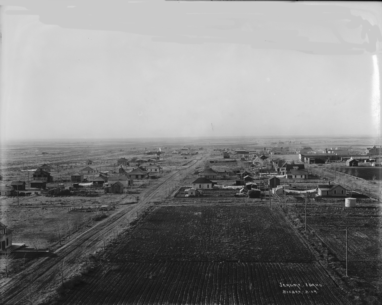 - "Jerome, Idaho;" wide view of the town, taken from the water tower; visible are the Jerome Livery; laundry, and lumber businesses; The Racket; Tailor Shop. The North Side Inn can be seen at the very right.