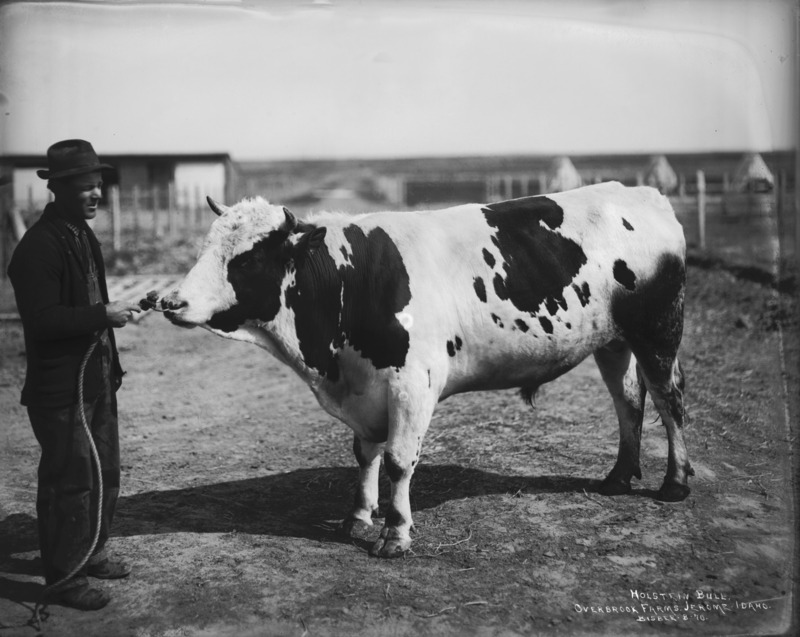 - "Holstein Bull; Overbrook Farms, Jerome, Idaho;" a man stands holding a rope tied to the nose ring of a cow.