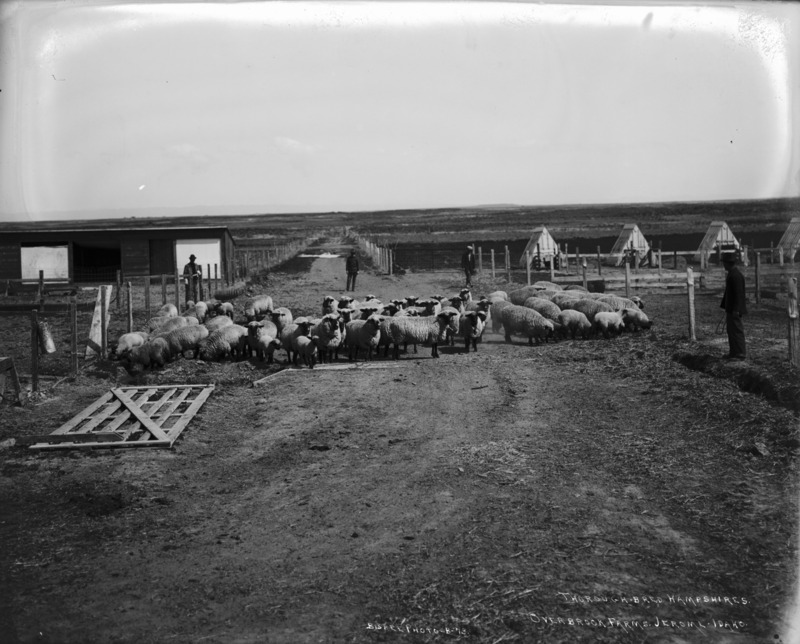 - "Thoroughbred Hampshires; Overbrook Farms, Jerome, Idaho;" several men look on as a number of sheep are directed dowen a fenced lane