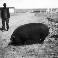 - "A prize winning Jersey Duroc; Overbrook Farms, Jerome, Idaho;" a man stands behind a large pig