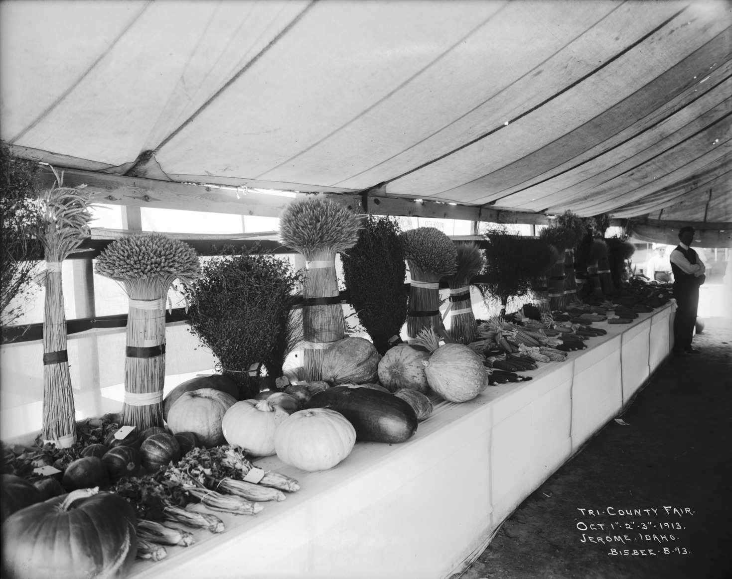 - "Tri-County Fair; October 1,2,3, 1913; Jerome, Idaho;" a man stands alongside a produce display in a large tent