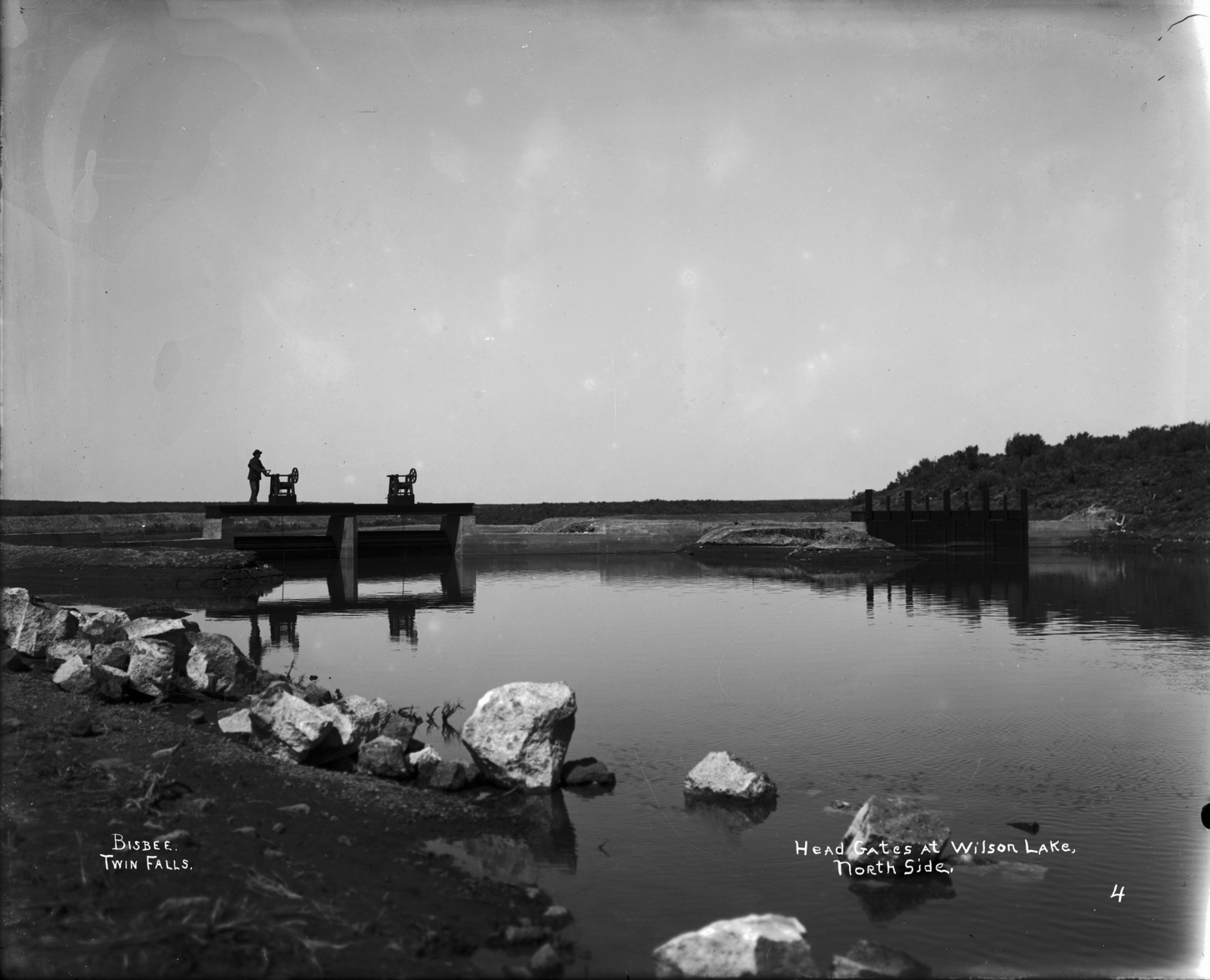 - "Headgates at Wilson Lake, North Side;" a man stands at the gates