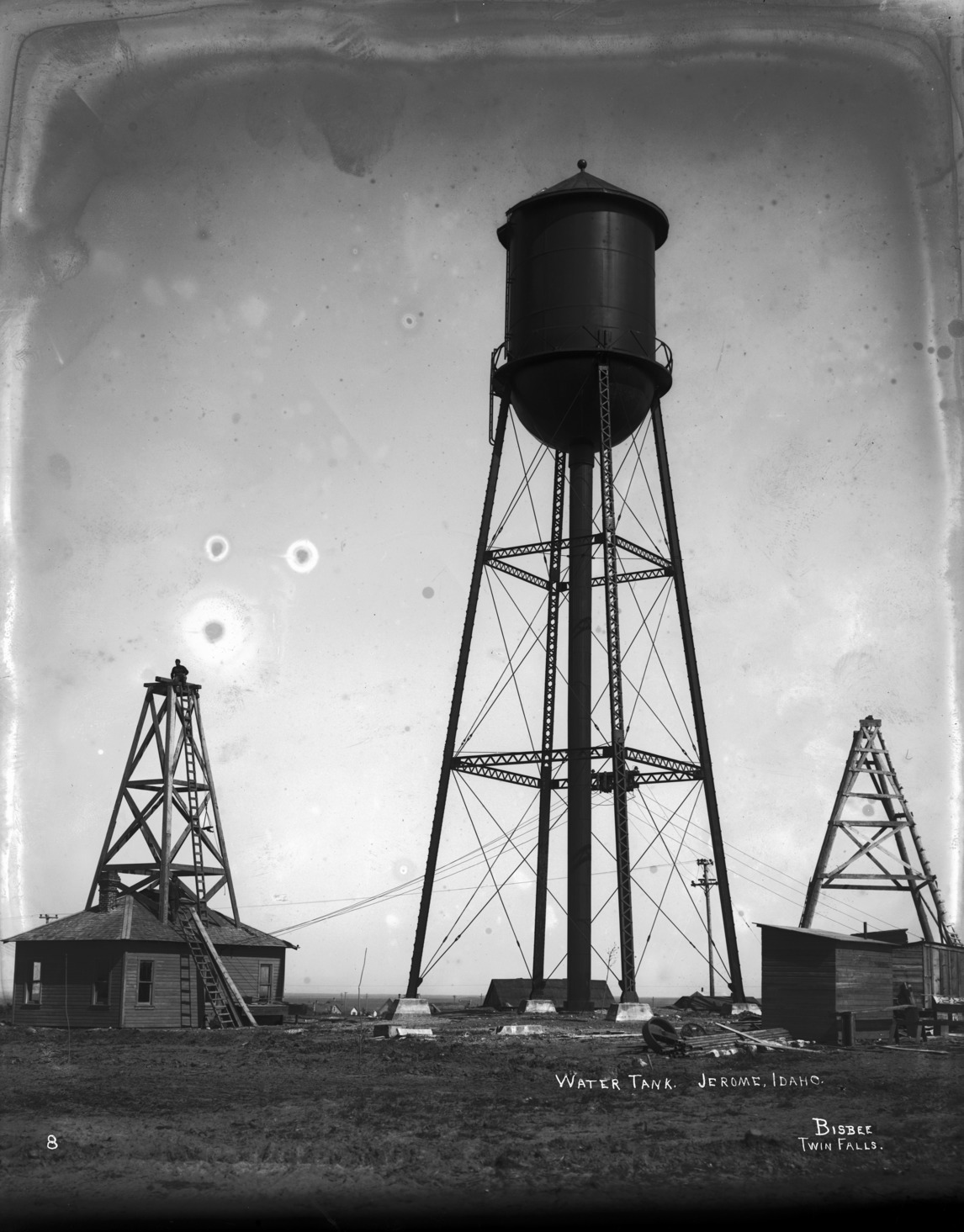 - "Water Tank. Jerome, Idaho;" water tank among other buildings; a man stand at the top of a structure on one of the buildings