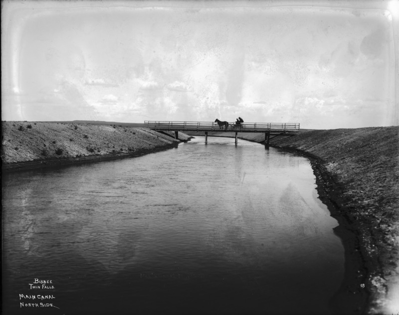 - "Main Canal; North Side;" a horse and buggy stopped on a short bridge over a canal.
