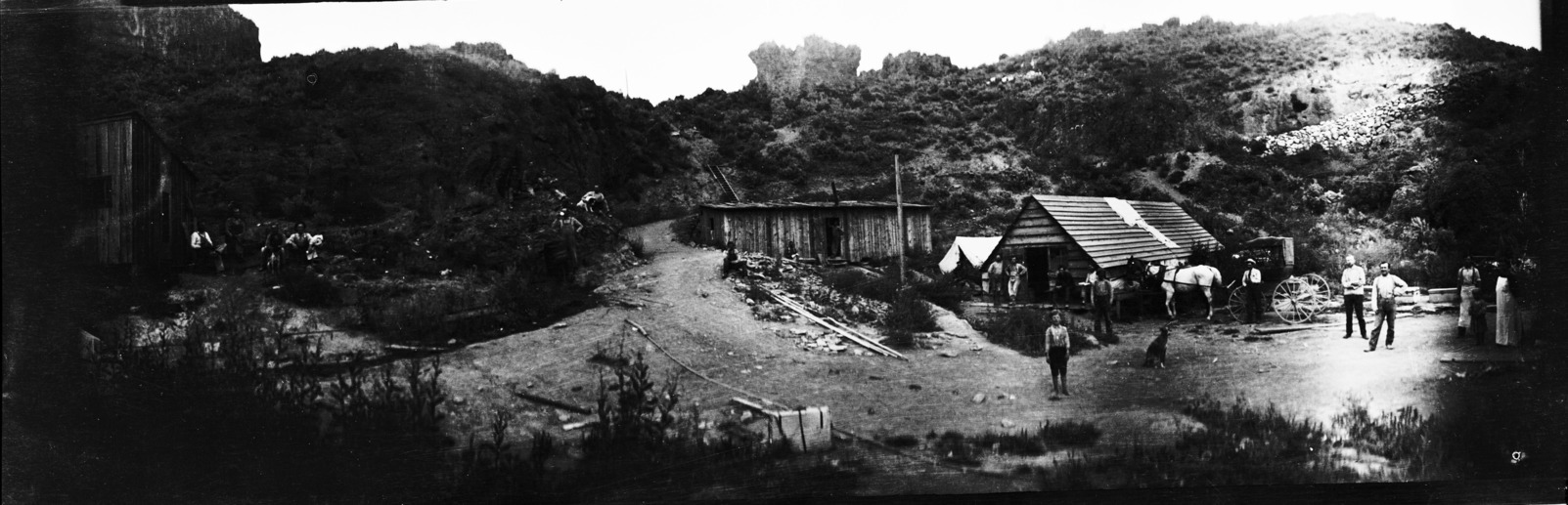 - A homestead situated alngside a canyon wall; several people pose in front of a cabin; another cabin, canvas tent, and horses and buggy are visible.