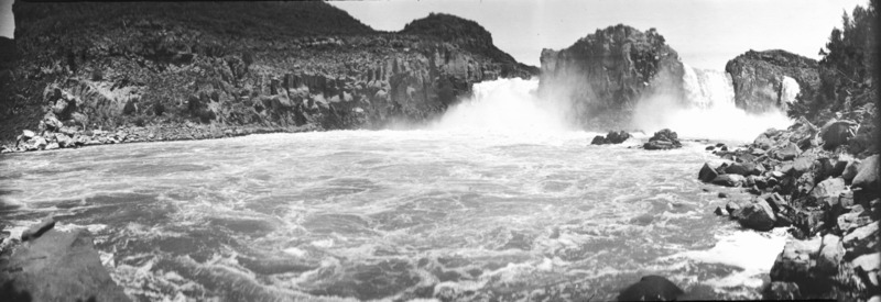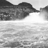 - View of Twin Falls from the Snake River. All three channels are flowing.
