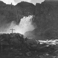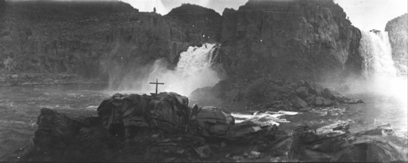 - View from below the Twin Falls in the Snake River Canyon; a cross has been erected on one of the rocks in the river.