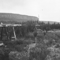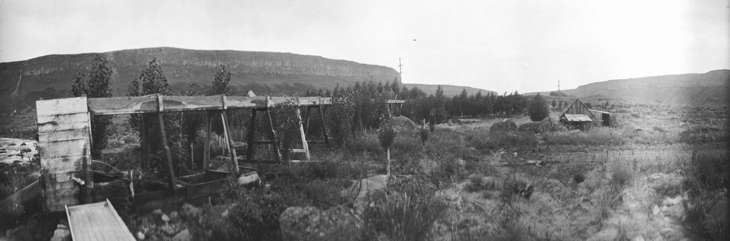- An irrigation channel runs water from a river into an orchard near a house in a canyon.