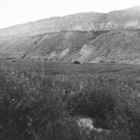 - Panoramic view of a field at the bottom of a canyon; a large dirt ditch on left.