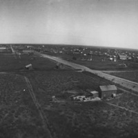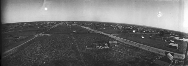 - Panoramic aerial view of Twin Falls, taken from the water tower, looking north. Bickel Elementary School is on right, and several houses and other buildings are visible. Main Ave in center.