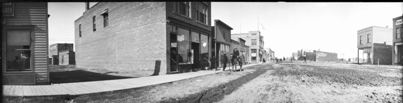 Panoramic view of Main Ave, looking northwest. A man on a horse speaks with two men standing on the wooden boardwalk and several people cross the street in the background. Visible businesses and buildings include: The Hub; Dr F. W. Pike, Physician and Surgeon; Star Restaurant; Sweeley and Sweeley; Idaho Department Store; Bedford Drug; Boyd buidling; Hotel Perrine; Eldrige's Clothing Store; Pioneer Storage and Commission Co.
