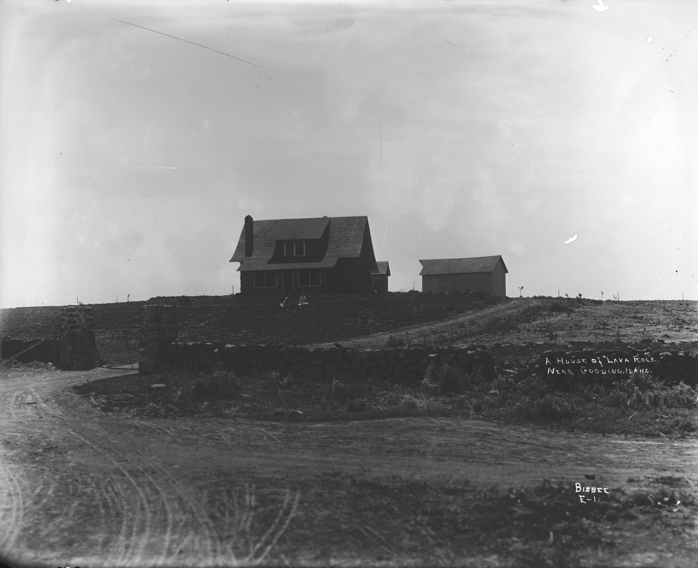 - "A House of Lava Rock, Near Gooding, Idaho;" a house and barn sit on a small rise; a lava rock wall with gate in foreground.