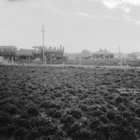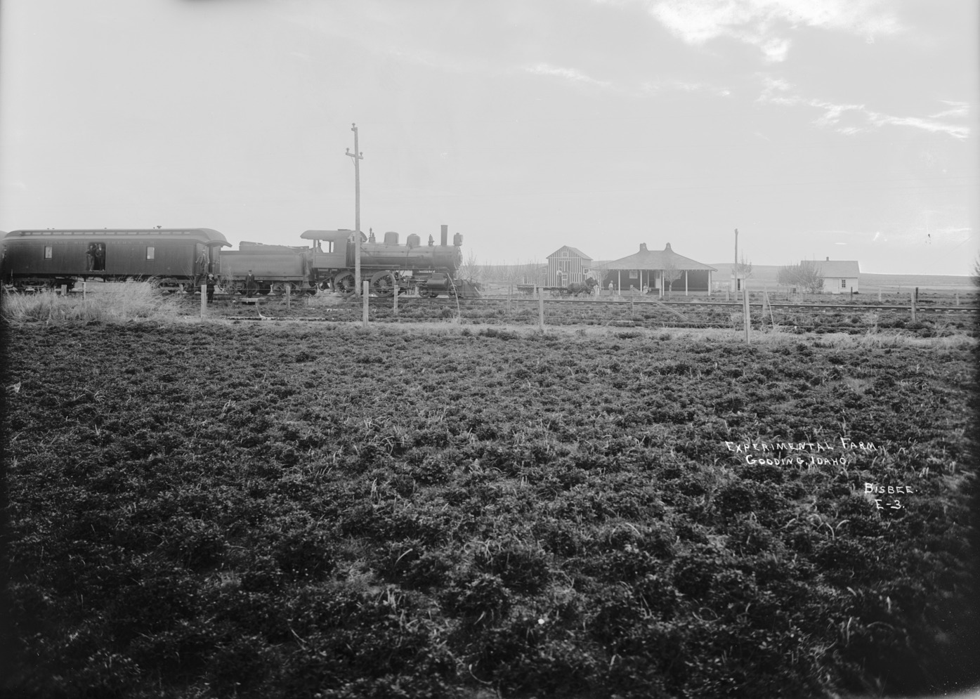 "Experimental Farm, Gooding, Idaho;" a house and outbuildings in background, with a field divided by railroad tracks and fenced lanes. A man drives a flat-bed wagon pulled by two horses in front of the house; another man looks on from the yard, and a woman and child are seated on the house steps. A train, labeled as Idaho Southern Railroad sits on the tracks at the right, with several men on or near the cars.