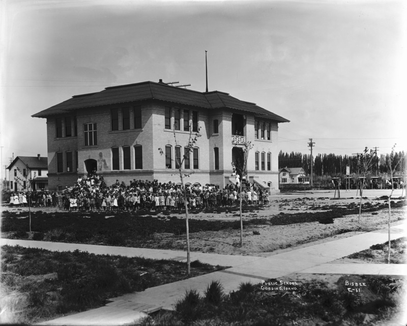 - "Public School. Gooding, Idaho;" a group of children pose in front of a three story brick school. Other houses and several wagons with horses can be seen in the background.