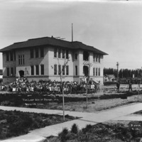 - "Last Day of School, 1912. Gooding, Idaho;" a group of children pose in front of a three story brick school. Other houses and several wagons with horses can be seen in the background.