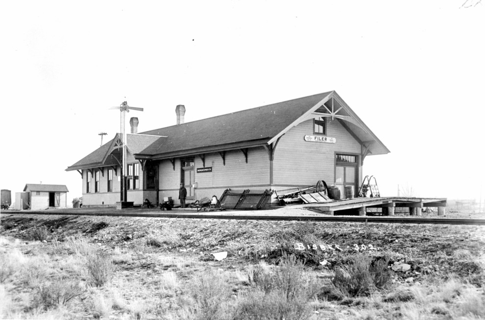 - Railroad station (depot) in Filer, a man stands in front.