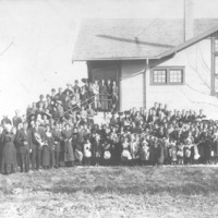 - Group of people, children and adults, posed on the steps and entrance of the First Christian Church. {Other denominations that used the building included the Immanuel Lutheran Church, Grace Baptist Church, Gospel Temple Church, and Reformed Church,}